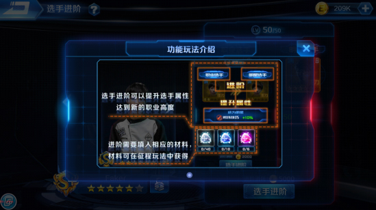 在选手界面中点击需要进阶的选手,如果有足够的材料即可进阶。进阶材料主要分为三种,分别为进攻训练材料、守护进阶材料、走位训练材料,等级分别有初级中级和高级,每个选手进阶所需的材料是不一样的,可以根据选手升阶需求调整刷图策略。