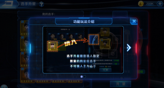 点击选手界面,点击相应的选手即可进行升星。在选手升星界面你可以消耗相应数目的同星级选手来提升所需培养选手的星级,例如:一个2星选手升3星,需要喂掉2个2星选手作为升星素材;一个3星选手升4星,需要喂掉3个3星选手作为升星素材,以此类推。另外要注意的是,主力选手是不能作为素材来喂的。同名选手在作为升星素材时,是无视星级的。所以前期可以用些低星选手来升星,同名选手可以作为高级素材,留到后期使用,节省培养时间。