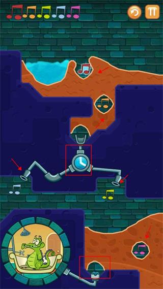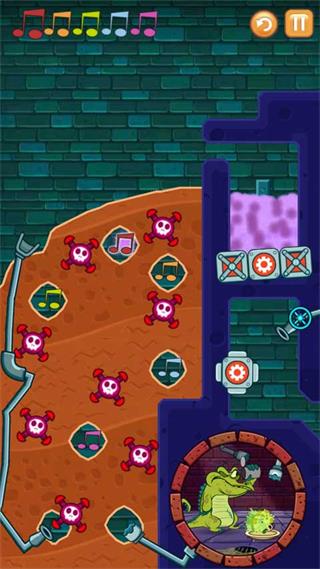 4、第二个关卡就是按正确的顺序把受污染的水导入所有的音符,还要小心作为的炸弹爆炸,同时还要保证小鳄鱼要有水洗澡。