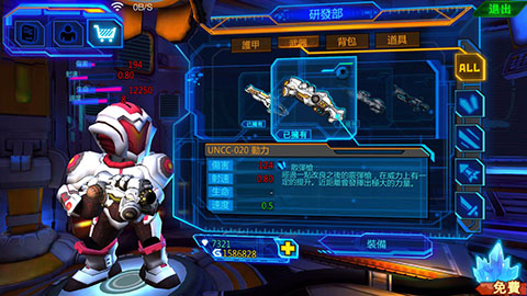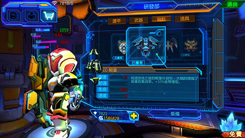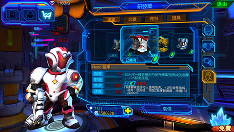 游戏中的装备是需要玩家们解锁关卡才能够解锁的,解锁之后就可以使用金币来进行购买了,其中价格不菲,但是也能够负担的起,其中装备包括护甲(头盔)、武器、背包,造型都是比较的酷,玩家们还可以花费一定的金钱来购买调色包,随意的更改自己装备的颜色。