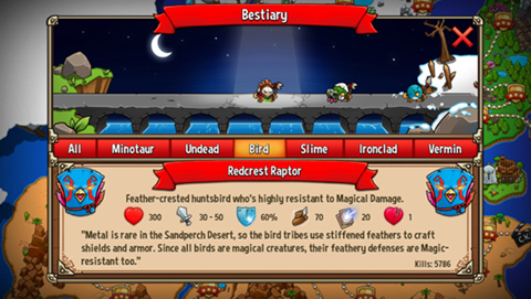 图鉴在游戏里也能调出来,看到新boss不要慌,先点一下看看再决定用哪个英雄去送死。抱怨没钻石复活英雄的可能都是这个问题吧,除了主角有装备外,其他英雄一般只有一个抗性。下面这个魔法boss 用鬼魂/Haunt(魔抗33%)去抗比同是金卡但是没魔抗的骑士/Valorius去抗可以多抗一下。直接决定是不是可以省下关键的16或者32钻石