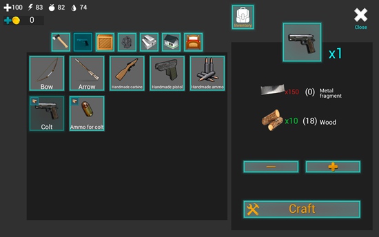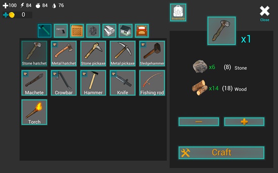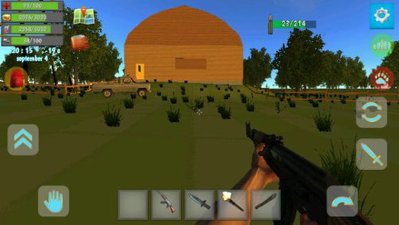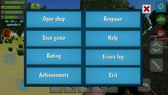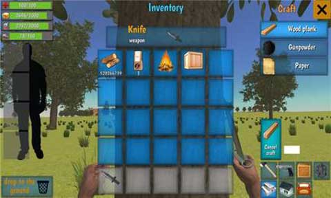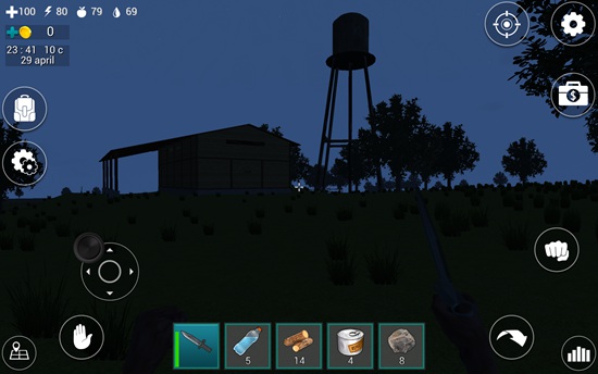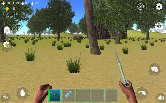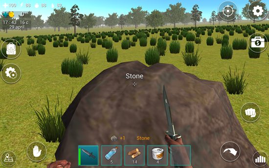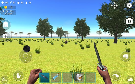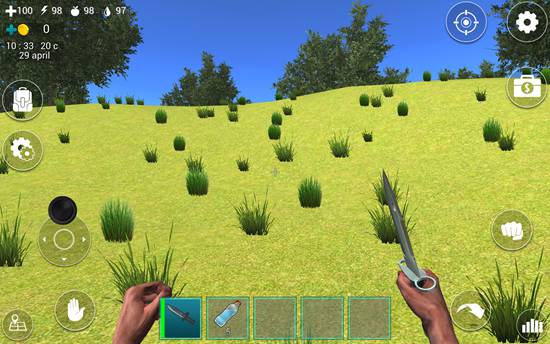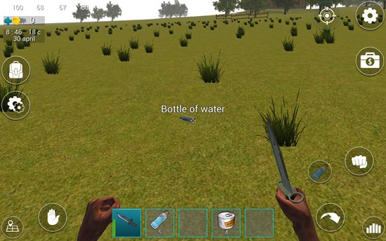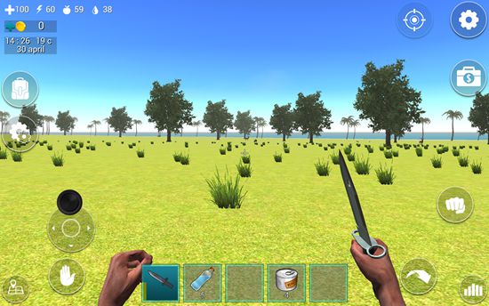 1、在屏幕下方的道具栏中有一把匕首,我们点击匕首即可拿在手中。在屏幕左上角有四个图标数字,分别表示血量、体力值、饥饿值、口渴值。