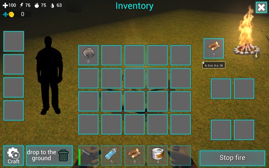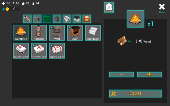 12、不过现在我们首先要做的还是一个火堆,制作一个火堆需要7个木头,点击火堆,然后点击右下角的“Craft”,即可制作出来。