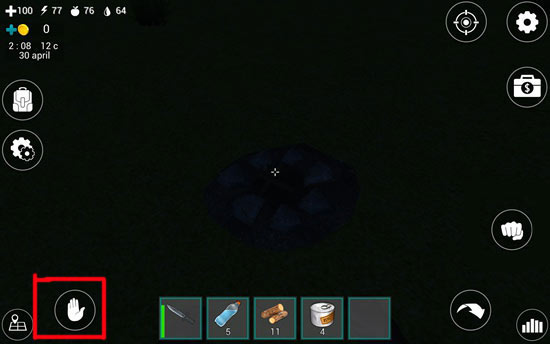 15、火堆放好后并不会燃烧,我们要对准火堆,点击屏幕左下角的“手掌”按钮开启火堆。