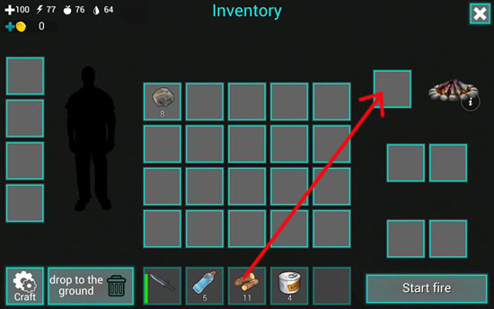 16、这时候会出现火堆和背包,我们要将木头拖动到火堆中才行,不然没有添加燃料,火堆是不会燃烧的。