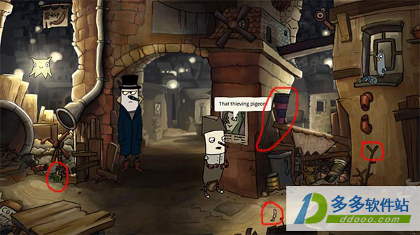 点击大门那站着的大叔,发现它原来是个开移动商店的哈哈,东西都带在风衣里。和它 进行了一大堆的对话后下边出现两个选项,garbage 和 pigeon 点击garbage 出现选项点击 birdfeed(那个袋子)又出现选项选择最后一个,经过对话后你会得到:会说话的布娃娃,和一个用绳子绑住的袋子。