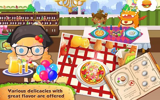 点击开始进入游戏就能看到布置精美的大厅啦,已经有客人在点餐了,赶紧去为他们准备佳肴吧。轻轻点一下客人,看看他们想吃点什么。瞧!菜单出来啦,上面还有相关菜品的介绍和制作步骤呢。现在点击"Cook"按钮开始烹饪吧,要知道这里的食材都是最新鲜的哦,加上顶级的厨具,保证能做出非常鲜美的食物。哇,右上角还有本菜谱,看看里面是些什么呢:牛排,披萨,意大利面……咳咳!被你发现啦,上面每个菜品都有5个神秘的菜谱等你探索。小厨神,要不要挑战看看呀?