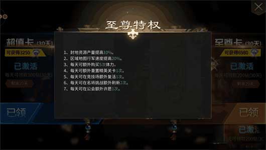 在至尊卡方面,要格外注意;拥有至尊卡便拥有了很多特权,如果没有这一步的话,充钱再说也是没有这个特权的。封地资源产量提高、区域地图行军速度加快、额外体力次数,这些都是主公们平时必不可少的资源。
