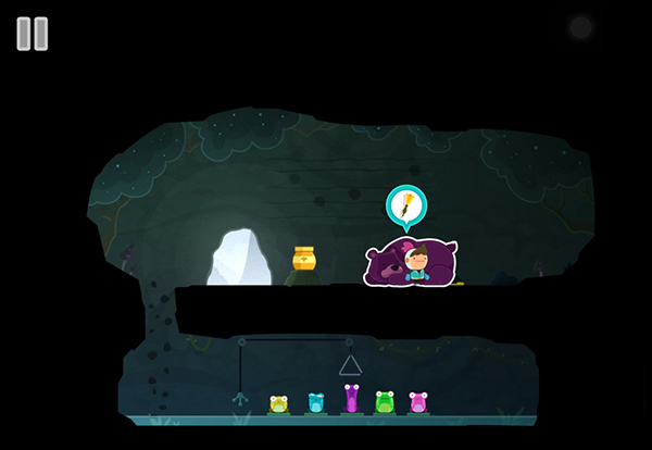 7、进去后,从左边下去会有一排青蛙,青蛙的叫声有高有低,按照熊上方的五线谱将青蛙排列好