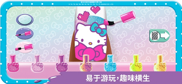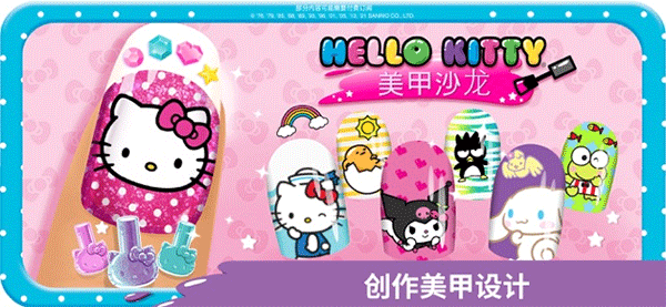 Hello Kitty美甲沙龙游戏苹果版是一款有趣的美甲点模拟经营小游戏,动画片中的hello kitty大家庭出来做起了美甲沙龙店生意,这个有爱的大家庭人员都是我们熟悉的卡通人物,包括小熊提比、小狗裘弟、小绵羊菲菲等等,大家全体出动、各自分工,后勤、送餐、扫地忙的不亦乐乎。在游戏中玩家要做的就是帮助hello kitty制作创作超级可爱的美甲和修脚,提升水准,达到巨星级美甲设计师,没错,在这里你可以自由的选择彩色指甲形状、指甲油颜色、各种可爱的图案和背景,如有兴趣就快来下载体验吧。