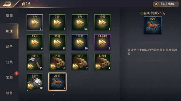 加速:如果出征的时间达到10分钟或者半小时乃至更久,可以使用游戏里面的加速道具缩减出征的时间(前提是你背包里面有加速道具)。