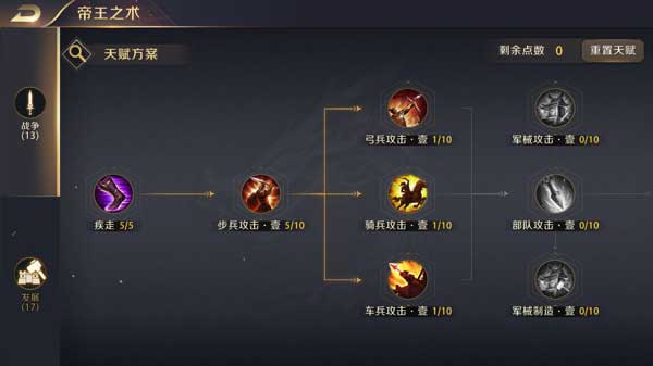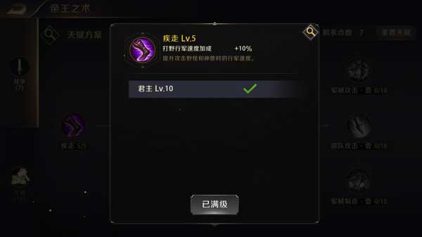 当玩家等级升到10级的时候,每升一级都会获得3点天赋潜能点,而这些潜能又可以升级兵种攻击,提升出征部队速度等,再次小编推荐各位小伙伴优先升级疾走。
