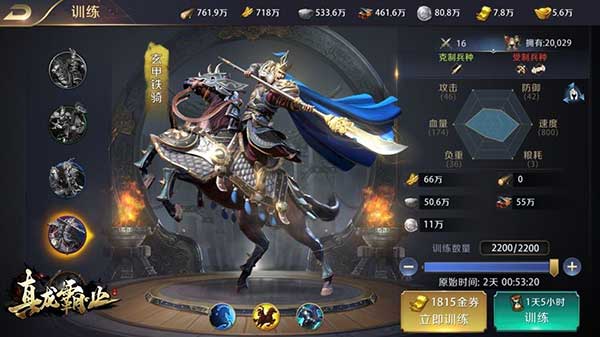 副本章节通关的同时,也是玩家官阶、武将兵种进阶的过程。不同于传统的战争策略游戏,《真龙霸业》在原有SLG玩法的基础上面,加入RPG养成玩法,不管是玩家个人还是武将兵种,均可不断进阶升级。其中,作为君主的玩家可通过帝王之术、宫殿等级以及官爵系统,不断增强战力;武将可通过升级、升星、进阶等玩法,提高武将个人能力。除此之外,通过“书院”的科技研究,武将所率领的兵种同样可以不断升级,从基础的步兵到铁甲卫、剑盾士,再到最终的御林神卫,各大兵种均可不断晋级,助主公成就最终的霸业!