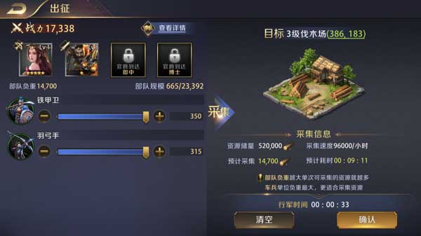 小编选择了旁边的一块资源地。出征界面显示行军耗费的时间是33秒,而越远的距离,耗费的时间越长。在你必须要打某个堡垒时候,要不选择使用迁城令,迁移到堡垒附近,要不只有耗费时间慢慢跑过去。