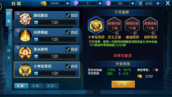 十字军圣印:提高一段时间内周围友军的攻击力,并使自身10%的命中等级提高,cd20秒。