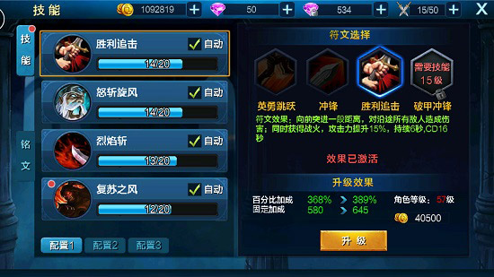 胜利追击:向前突进一段距离,对沿途所有敌人造成伤害;同时获得战火,攻击力提升15%,持续6秒,cd16秒。