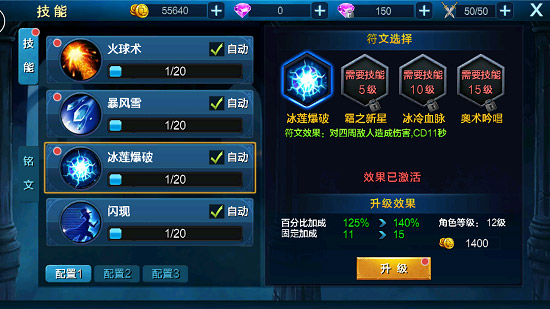 技能一可选择的四种符文(符文随技能等级开启选择)和各自的符文效果: