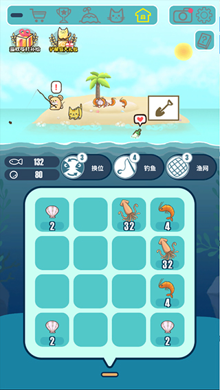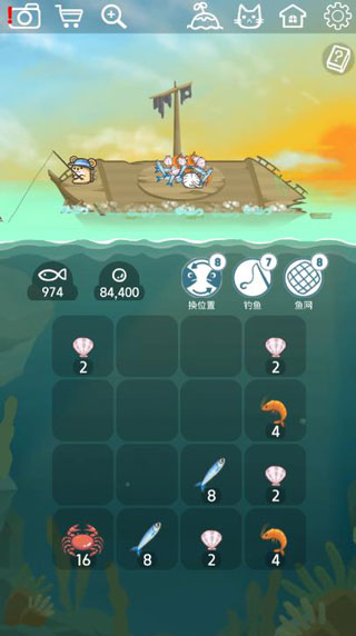 游戏的玩法还是比较经典的,玩法2048的朋友应该都比较容易接受,其中被消除的东西都会掉落于船上,而累积的鱼数量也可用于兑换更多不同的猫咪类型。同时2048的玩法还是那么的经典,其中只是还加入了换位置、钓鱼、渔网等功能,从而让你在滑动的过程中更好的进行叠加。