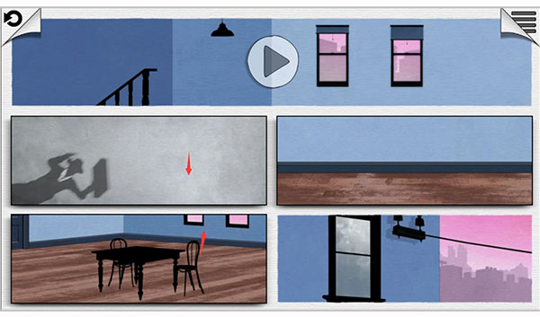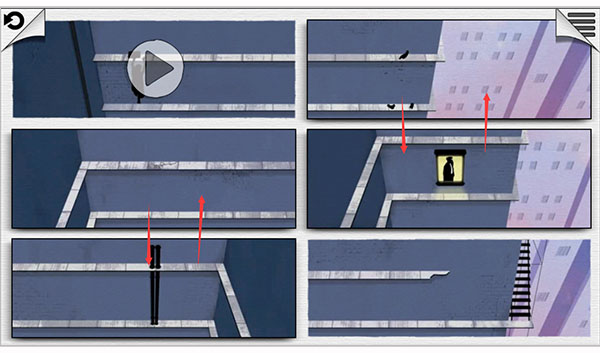 随主角来到了窗外,行走在狭窄的墙上,不仅要躲避窗口警察的目光,还要时刻注意脚下,一不小心踩到破碎的墙体便会掉入万丈深渊,我们只需要把图片按照箭头的方向调转一下,主角便可安全渡过