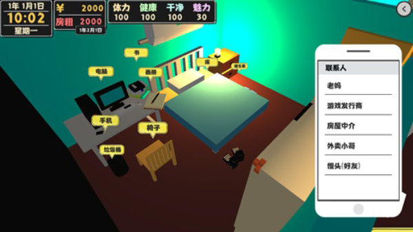 游戏即将在4月中旬开测,整体感觉游戏对新手玩家更加友好了。与前作最大的不同是这一次我们增加了一个室友——阿伟,我们和他一起租住在一个公寓中。另外游戏的属性变得更加简单明了了,只有四种属性,分别是体力、健康、干净、魅力,这与更方便新手玩家们的理解。