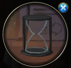 查看正前方桌面上的沙漏并在鸽子下方捡起一瓶猫头鹰饲料,在椅子下有一盒火柴也捡起来。
