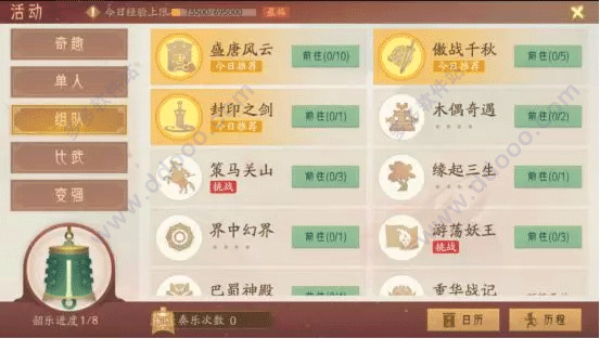 每天建议至少完成8个任务(其实很快1小时就搞定),敲钟第八次能拿1000通宝,积少成多的前提下能获得1次“奏乐次数”,目前每日活动列表中有推荐任务,每天完成推荐任务可以获得额外一次“奏乐次数”,等于抽奖2次,奏乐里面有传奇灵佑契约和高级技能箱子,梦想总是要有的!挑几个任务把每天经验做满,剩下的就看个人时间,可肝可不肝~