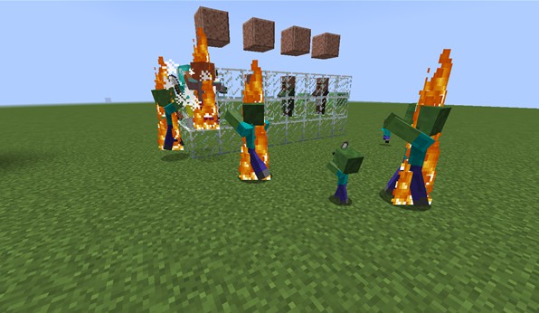 当然,这些僵尸的袭击是有原因的,只要村民丧命于他们的手中,就会有可能被转化成为僵尸村民。为了更好的说明,在这里做了个小小的装置用于观察村民与僵尸的转化。