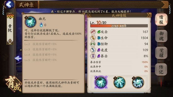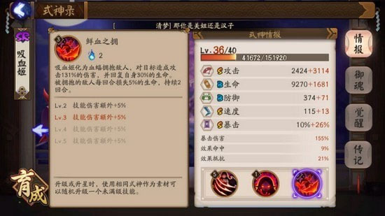 提到反击流,另一个不可少的式神就是吸血姬。吸血姬的普攻伤害血越少越厉害,如上所述,御魂首推狰。血袭技能堆满伤害为145%,本身S攻击加上御魂效果和暴击,血量低的式神经常一口咬死。御魂除了狰以外,另外两个位置加暴击或攻击都可以,当然为了保险也可以对一下效果抵抗,因为之所以反击就是因为自己不是先手,有时候遇到控制流的对手很烦,所以堆一下效果抵抗可以让吸血姬不被控制反而咬死对方。