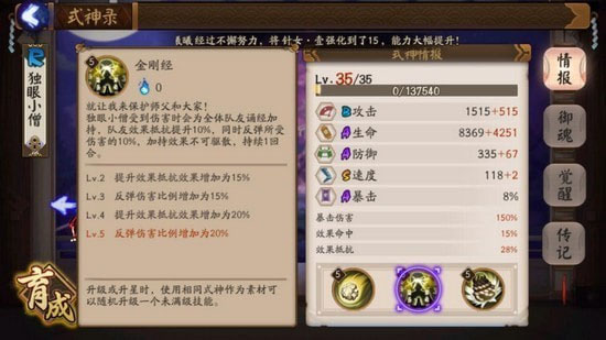 第三个反击流式神是个R式神独眼小僧。这个式神主要技能金刚经就是为反击而生的。受到伤害时为全体队友诵经加持,反弹20%伤害,增加20%效果抵抗。大家不要小看这个技能,带上独眼小僧,阵容中再带一个镜子,遇到双拉条对手时,有时我都不用出手就弹死对方了。