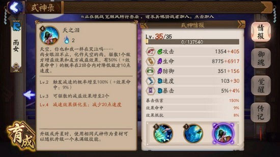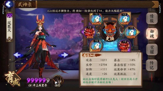 有时候我会用以下的凤凰火替换独眼小僧就成了曾流行一时的雨火流。技能虽然没满级,但她主要不是用于攻击。凤凰火不用多说,偷暴击率,眩晕效果50%且不可驱散,暴击时有可能再行动一次补攻一下没有眩晕的小伙伴。御魂我带的火灵既能充当打火机又增加效果命中。这里补充一下,凤凰火的速度一定要在雨女后面,而且不要差太远,避免被对方控制式神插队。