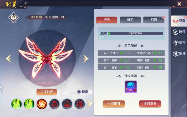 在羽翼页面可以直观地看到羽翼加成的各项属性,以及对羽翼进行培养升阶提升属性,为羽翼附加幻翎更可以百分比提升战力!