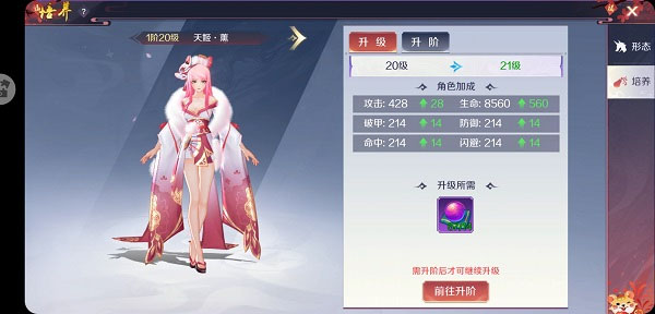 在培养界面中,灵主大大可以使用天姬灵丹对天姬进行升级,在达到该阶满级后可以使用天姬突破丹对天姬进行升阶,升级升阶可以大大提高玩家大人的战力哦!注意,升阶还需要满足一些进阶条件哦。