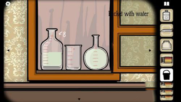 1、首先,我们在房间中的煤油灯旁边可以拿到钥匙,使用钥匙开启实验桌上的柜子,即可看到三个空着的烧杯,