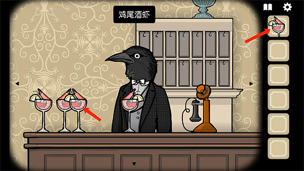 3、点击前台上的鸡尾酒,将它们陆续拿走,前台乌鸦会说:给他们奉上我们的特色菜,