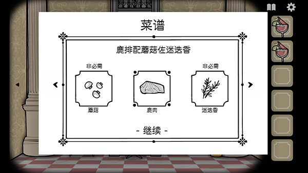 8、然后去往电梯破旁边上的画像,看见画像中的人物拿着东西,放大后到手里的东西是蘑菇,之后弹出提示:获得迷迭香蘑菇煎鹿排中的配料蘑菇,
