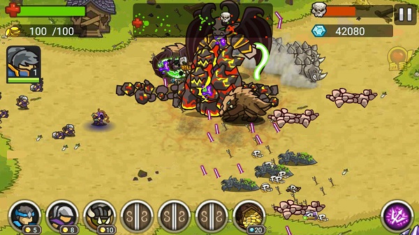 玩家进入关卡前先选择要派出的英雄,士兵和可使用的技能;在关卡会自动增长金币,消耗金币选择我们要召唤的士兵,用钻石可以释放技能帮助我们击杀大量的敌人,把对方的大本营毁灭或者击杀关卡BOSS即可获得通关。
