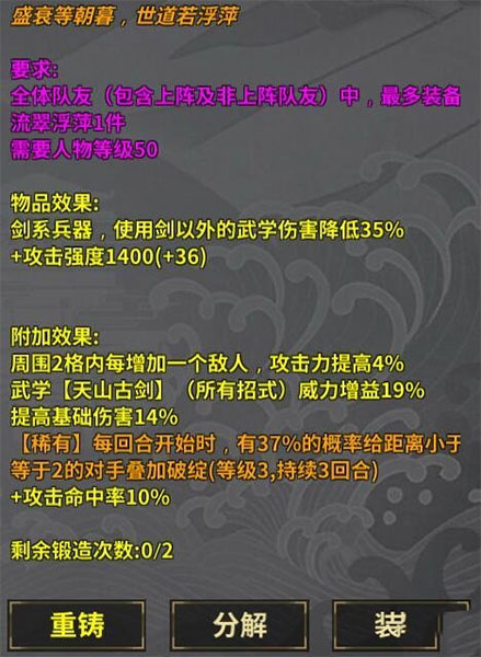 5、重铸等级就是该装备重铸的次数, 会随着次数的提升同时提升装备的一些固定属性, 武器重铸缓慢加攻, 其他重铸缓慢加生命, 等级越高的装备这个上限越高。
