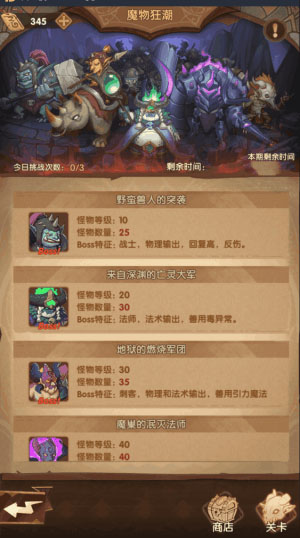 魔物狂潮:玩家每日可挑战3次,玩家通过攻打关卡获得‘破碎的身份牌’,魔物狂潮分为10关,每一关的关卡开启需要前置关卡通关;每一关需要消灭关卡里面的怪物,随之关卡的不同需要消灭的怪物数量也不同;从此次测试来看魔物狂潮每期是有时间限制的,时间到期后会更换兑换物品;