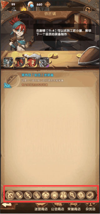剧情副本通关7-2后开放铁匠铺,小伙伴可在铁匠铺中打造不同类型的SR装备,但是打造装备也是需要材料的;
