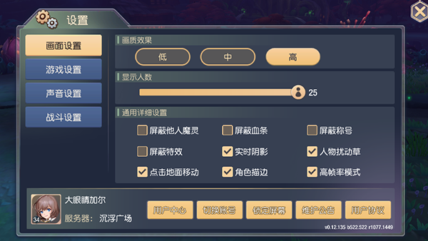 打开游戏右下角的【设置】图标,这里集合了画面、游戏、声音和战斗设置四大项,下面为大家简单介绍一下吧。