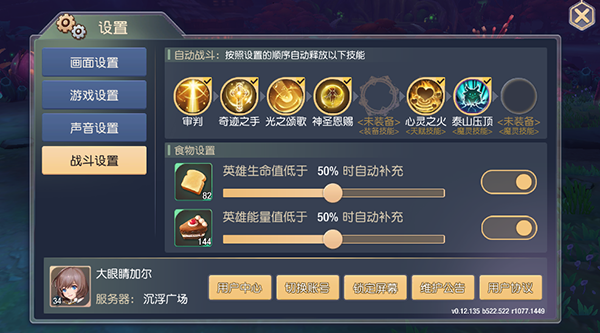 这里日常使用最频繁,可以自定义挂机技能释放顺序,自动回复的食物设置。