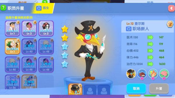 通过医治病人和完成日常订单等任务获取职员经验值对职员进行升级,职员等级达到一定级别的时候可以通过职员证书晋升职员