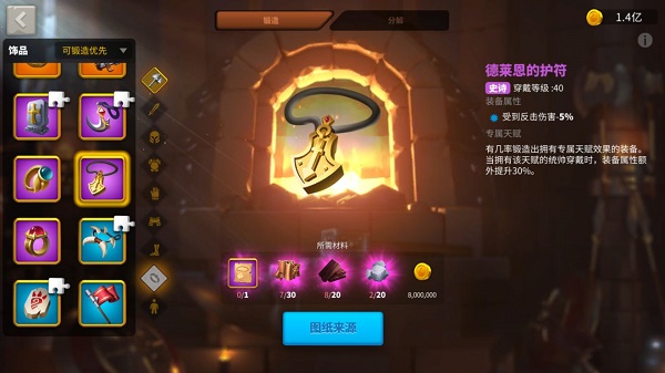 紫色饰品有用的只是沉寂审判和德莱恩的护符,且都是野蛮人营地和野蛮人要塞掉落,获取难度还是比较高,所以护符自选可以从这两个里选,优先选德莱恩的护符减少点伤害,辅助类型的将领可以选择沉寂审判提高点辅助能力。