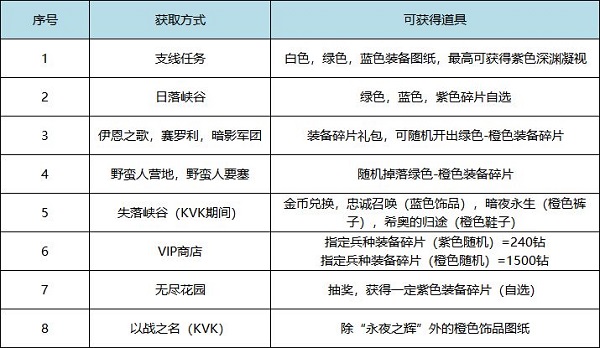 获取方面暗影军团可以获得鞋子和手套,日落峡谷还有装备图纸碎片宝箱都可以开出头盔和上衣。