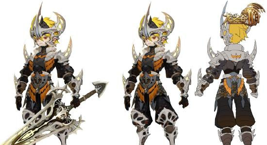 沙漠龙套装中,女弓手身着暗色盔甲尽显沙土感,风尘仆仆却潇洒自如。龙翼龙鳞装饰的大裙摆烘托了女弓手的端庄气质,任你尘沙飞扬,我自岿然不动的强大气场自然是女弓手才能拥有的。