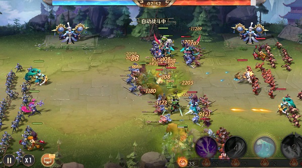 2、竞技场战斗为自动战斗,左下角的暂停键点击之后可以呼叫出菜单进行特效上、音效上的设定,调整战斗速度的按键也同样在左下角,上方的红、蓝色血条可以展示双方当前的实力对比,可以更加容易的洞悉场上的形式。