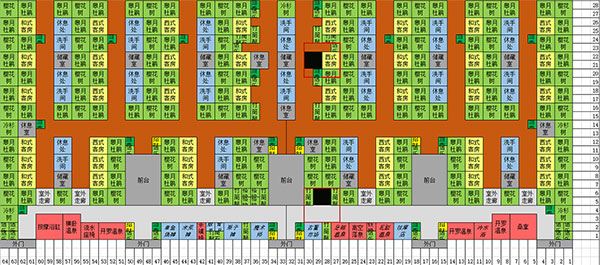 2、布局图上半部分的中间是“商业区”,每种设施只用一个,实现所有的契合度组合。没有契合度组合的设施也放置在了这里。两边是男女温泉区,放置了所有四种温泉,并且实现了每个温泉都有除了异性加成之外的六种温泉功效(例如男性的温泉没有花瓣之池和盐之池这俩增加女性契合度的功效)。