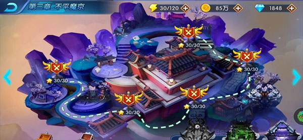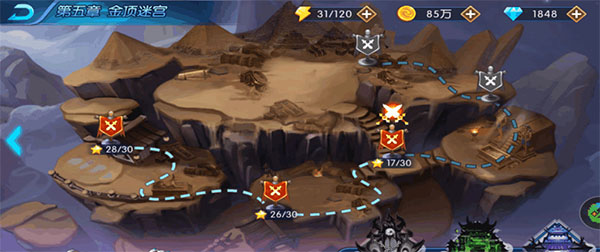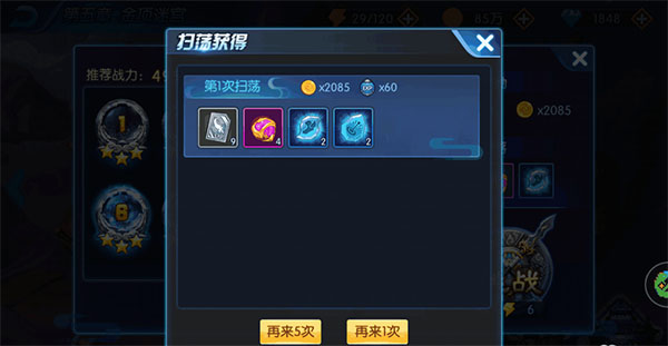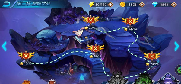 每张地图系统会根据您的通关表现(漏怪数目)给您打星,零星即为不通过,三星为满分,只有三星地图才能扫荡。每个章节评星数累计到一定数目可以打开神秘宝箱获得金币、钻石、装备。有点要提的,首次通关地图奖励经验和金币是以后的十几倍。