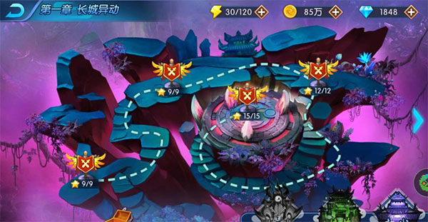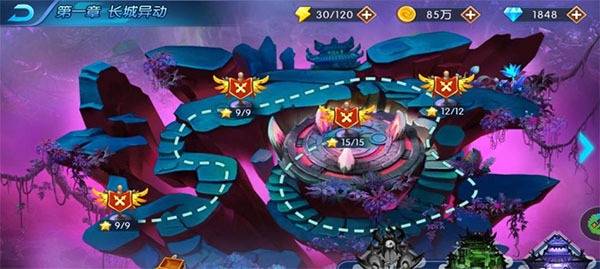 每种模式又分为5章(目前本人只解锁到第5章),分别为:《第一章长城异动》、《第二章皇陵之变》、《第三章不平魔都》、《第四章震慑雪岭》、《第五章金顶迷宫》。每章分为3到5大关,每关又分为1~10张地图。可以说最大限度的满足爱好塔防玩家的您。