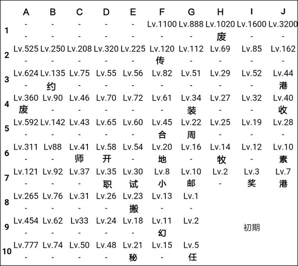 Lv162-250区域(最高Lv320)开放区域60个(和平度69%)